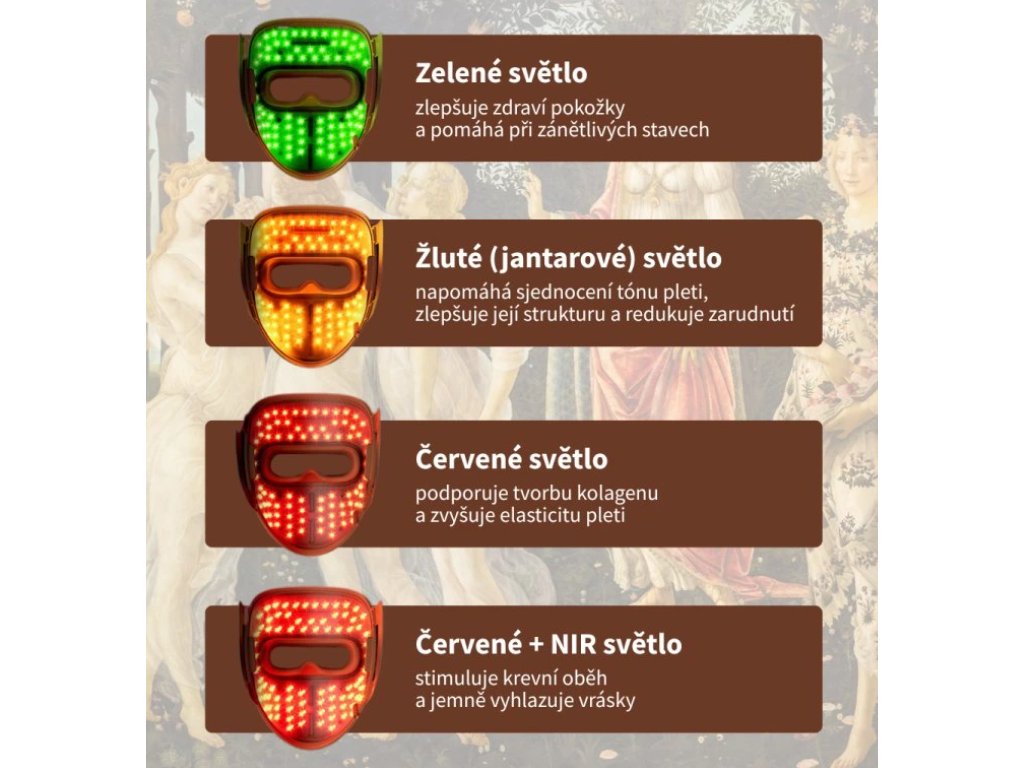 Kombinace červeného a NIR (blízkého infračerveného) světla stimuluje krevní oběh a jemně vyhlazuje vrásky.